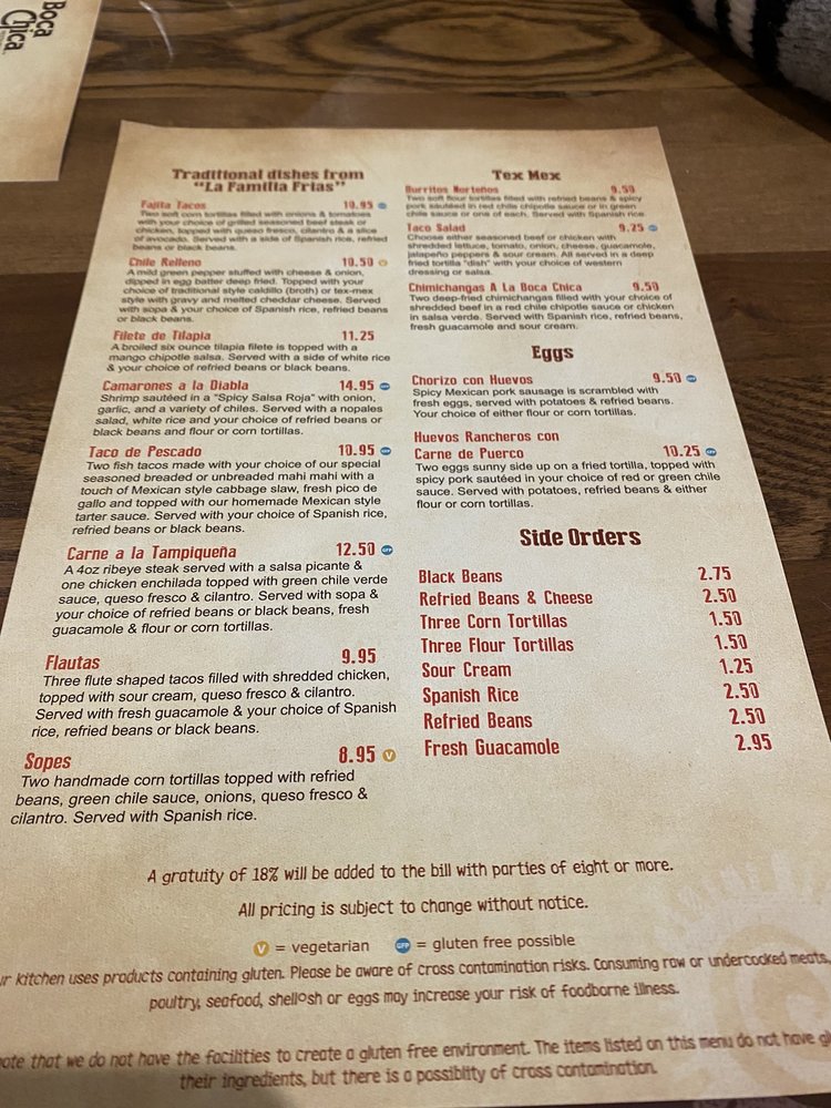 Introducing the menu at Boca Chica Restaurant, a beloved Mexican establishment in Saint Paul, MN. Known for its authentic TexMex dishes and family-friendly atmosphere, Boca Chica offers a wide range of options for lunch and dinner. From traditional enchiladas like Enchiladas de Guajillo and Enchiladas de Mole to Tex Mex classics like Enchiladas de Pollo and Enchiladas Suizas, there is something for everyone to enjoy. Customers rave about the fresh chips and salsa, flavorful sopa, and delicious mole sauce. The restaurant also offers a Sunday brunch with a great variety of dishes. With attentive service, generous portions, and a fun atmosphere, Boca Chica is a must-visit for Mexican cuisine lovers in the area. Visit Boca Chica Restaurant at 11 Cesar Chavez St and experience the flavors of Mexico for yourself.